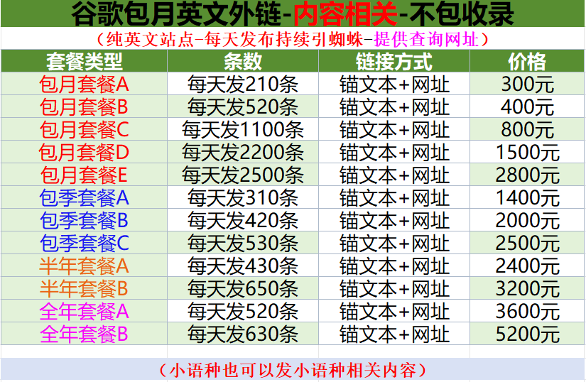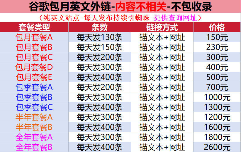 3、我们只出售外链不包您网站升BR、PR值,因为外链只是影响网站BR、PR值的一个其中的一个重要原因,但不是仅有因素;另我们所售外链不包升网站关键词在搜索引擎中的排名,因为外链只是影响排名的一个重点因素,但不是唯有因素,因为关键词的最终排名涉及到多个因素。